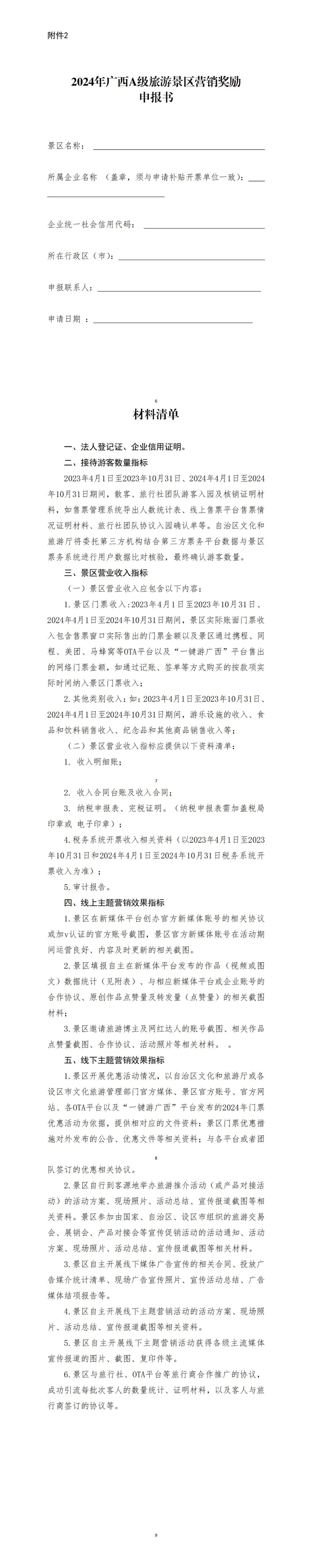 为认真贯彻落实习近平总书记对旅游工作重要指示和全国旅游发展大会精神,落实自治区党委、政府关于扩大消 费的决策部署,进一步激发文旅消费活力,决定组织开展2024年广西A级旅游景区营销奖励工作,特制定本实施方案。在广西区内依法注册、运营并具有独立法人资格的A级旅游景区。(一)景区应使用客流监控系统、票务管理系统(闸机系统)、入场预约系统、电子票务核销等游客数据统计平台。(二)申报主体应在奖励时间范围内自主开展景区线上、线下主题营销活动,并取得良好效果。此次奖励资金申报评审,将根据满足申报条件的景区在活动时间(2024年4月1日至2024年10月31日)自主开展景区营销工作情况,从游客接待量、景区营业收入额、线上、线下主题营销宣传效果等方面进行综合评分,并按照分数排名对前20名的申报景区给予营销奖励。其中,第1—10名奖励20万元/家;第11—20名奖励10万元/家。若出现分数相同的情况,则按景区接待人数进行排名,以此类推。按照企业申报、各市文化和旅游行政管理部门初审、自治区文化和旅游厅终审、公示和拨付等工作流程组织实施。??符合申报条件的景区,填报《广西A级旅游景区营销奖励申报书》,对照资料清单(详见申报书)准备相应材料,根据企业注册地行政区域,于2024年11月10日前寄送所在市文化和旅游行政管理部门。各市文化和旅游行政管理部门审核提交材料及相应台账的完整性、真实性、合规性,在《广西A级旅游景区营销奖励申报书》中填写初审意见。各市将通过初审的景区进行排名,填报《广西A级旅游景区营销奖励推荐汇总表》,并于2024年11月18日前报送至自治区文化和旅游厅。自治区文化和旅游厅委托第三方机构,对通过各市初审的景区奖励申请材料进行复审,经厅党组会审议,确定拟奖励的景区名单和金额。自治区文化和旅游厅将拟奖励景区名单和金额在自治区文化和旅游厅官网向社会公示,接受公众监督。公示期满无异议的,按照财政资金拨付流程拨付至相关景区。(一)申报审批流程应程序规范、公开透明、公平公正,由第三方专业机构进行监督和票据核查。(二)各设区市文化和旅游行政管理部门应当对照奖励条件和评分细则进行认真审核,对材料提交不完整的应当要求其补充材料,补充材料仍不符合规定的初审不予通过。(三)各申报景区应对提交材料的真实性、准确性、完整性负责,所获得奖补资金应专款专用,全部用于生产经营活动,主动接受有关部门的监督检查。凡弄虚作假、伪造资料凭证,或者多头、多项申报的,一经查实将依法取消申报奖励资格,已发放的奖励予以追回,向社会通报批评。如涉及恶意套取财政资金,一经查实 ,将移交相关部门追究法律责任。(四)未使用客流监控系统、票务管理系统(闸机系统)、入场预约系统、电子票务核销等游客数据统计平台的景区不参加本次奖励活动。(五)参加“秋冬游广西”、“冬春游广西”门票优惠活动需整改的景区,未完成整改前不得参加此次奖励申报。(六)申请奖励的景区在2024年1月起至奖励名单公示期结束前,有下列情形之一的,取消其申报奖励资格。1.申报主体被认定为严重失信主体、出现重特大安全事故、受到罚款及停业整顿等行政处罚情形。2.发生重特大安全事故、重大投诉,造成恶劣影响等情形。(七)本实施办法解释权归广西壮族自治区文化和旅游厅所有。附件:1.2024年广西A级旅游景区营销奖励评分细则??????2.2024年广西A级旅游景区营销奖励申报书??????3.2024年广西A级旅游景区营销奖励推荐汇总表??附件:1.2024年广西A级旅游景区营销奖励评分细则 2.2024年广西A级旅游景区营销奖励申报书 3.2024年广西A级旅游景区营销奖励推荐汇总表.doc