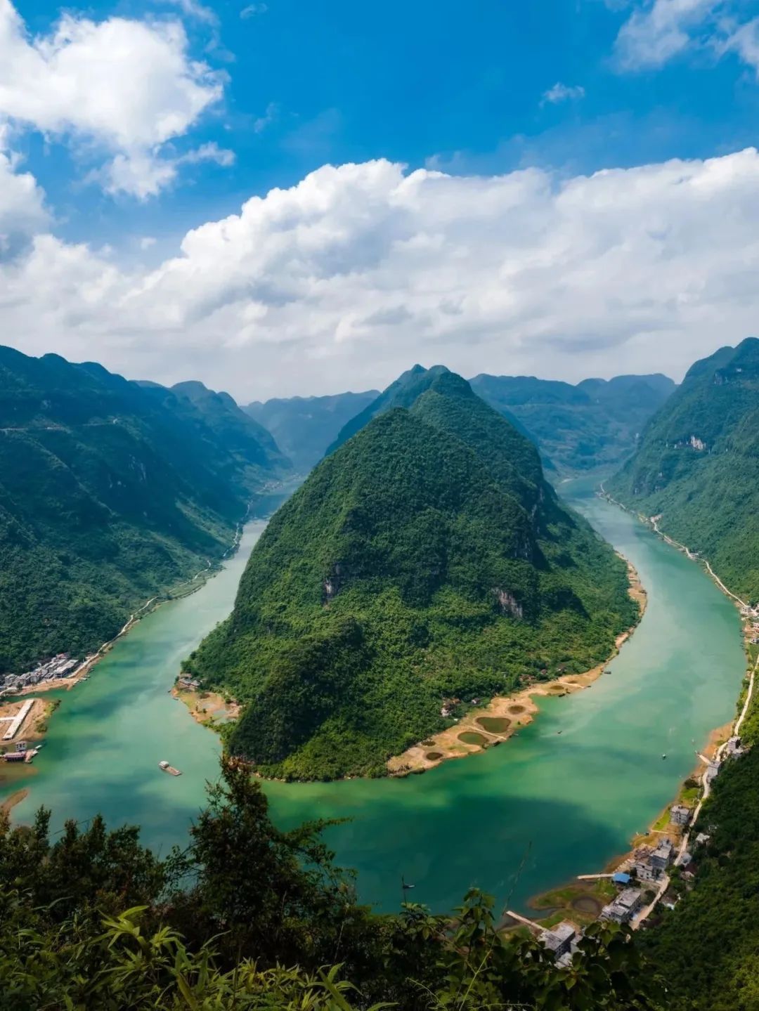 正是这一道转弯,造就了“长龙环珠”的壮阔之势。登上建在河湾正南方向的铜鼓玻璃栈道观景台,凭栏远眺,巍巍青山独立于一湾碧水中,仿若神龟凫水,其景之阔大,足见自然之匠心。