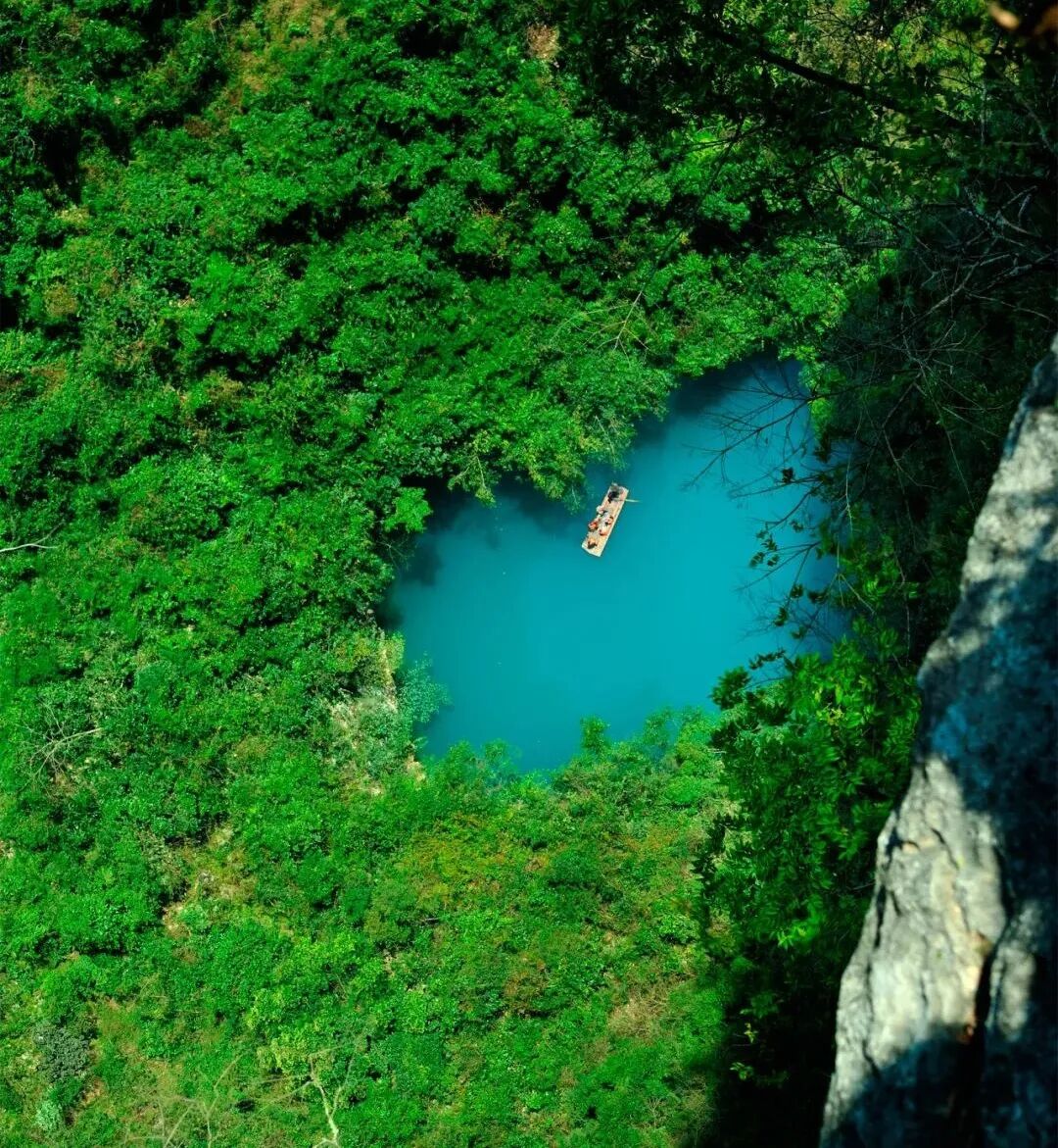 山中有海,海上有门——这是凤山县三门海。三门海发育了七个串珠式岩溶天窗群,这是一个隐秘的景点,它不是“蓝洞”却胜似“蓝洞”,有比海更令人惊叹的蓝绿色。