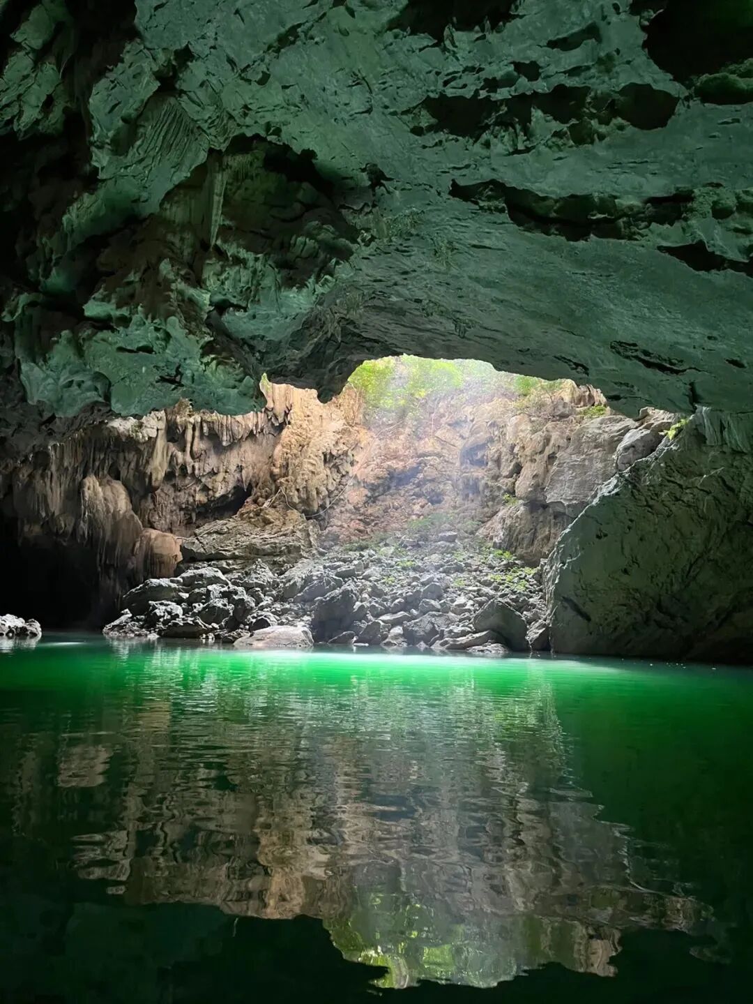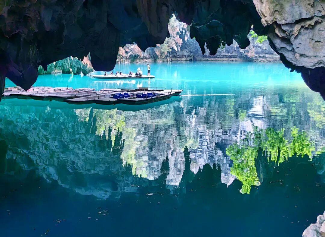 沿着湛蓝的水面乘船进入洞中,天窗透下来的光投射到幽暗的溶洞内,清澈的水面形成一片片闪动的光斑,光影交错间,溶洞壁顶水珠滴落到水面,叮咚作响,寂静的溶洞更显空灵,让人有一种置身时光隧道的感觉,仿佛误入《桃花源记》的异乡者。