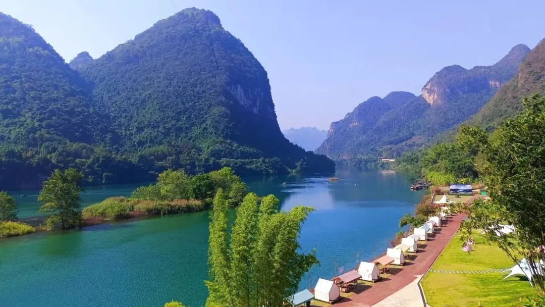 位置导航:天峨县江滨路县城右岸码头亲水平台、丘英游客集散中心码头、云岭梦乡露营地坐落在天峨县云榜村,数十顶白色帐篷错落有致地搭建在青山绿水间。