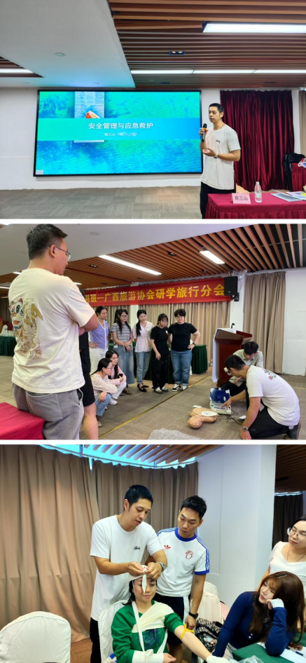 在安全应急方面,广西壮族自治区人民医院急诊科副主任医师祝三山,结合其在广西中毒委员会和广西胸痛委员会的丰富经验,为学员们带来了《研学活动应急救护及中小学生常见问题处理方法》的专题课程。通过实战演练,祝老师确保每位学员都能掌握必要的急救技能和应对策略。