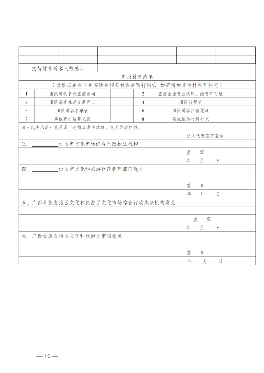 (一)申报流程:①旅游企业申报——②各设区市文化和旅游行政管理部门初审——③自治区文化和旅游厅复核——④第三方机构审核并出具意见——⑤厅党组会(厅务会)审议——⑥公示——⑦拨付奖补资金。(二)申报及审核时间:资料申报截止时间:2025年1月6日。自治区文化和旅游厅于2025年1月27日前完成全部补助资金审核及拨付工作。申报单位须于上述规定时间内向其注册地所在设区市文化和旅游行政管理部门提出申请,填写《2024年第四季度接待境外游客来桂奖励审批表》或《2024年第四季度赴境外开展文旅推介补助审批表》并附相关证明材料。逾期不予受理。申请奖补的旅游企业须严格按照本《细则》进行申报,申报材料清单如下:1.《2024年第四季度接待境外游客来桂奖励审批表》(附件1),电子版与纸质版同时提交,纸质版须与电子版表格内容一致并加盖公章。2.组团社与地接社的团队确认书,或直接与境外游客签订的旅游合同、结算单据等确认材料。3.抵桂和离桂火车票或飞机票、团队行程单、旅行团成员名单(须含姓名、性别、护照号等其它旅行证件信息)。4.订房确认单、住宿人员名单(酒店盖章)及住宿发票(需备注团期及人数)。5.其它能证明旅行团真实存在的补充材料(如旅行社全年纳税证明材料、团队付款凭证、带水印团队合影等)。1.《2024年第四季度赴境外开展文旅推介补助审批表》(附件2),电子版与纸质版同时提交,纸质版应与电子版表格内容一致并加盖公章。2.购买境外(含港澳台)国际性旅游展会展位或租赁境外(含港澳台)场地开展广西文旅资源、产品推介促销活动的发票、收据、场地租赁合同等合法凭据。3.前往境外(含港澳台)开展推介促销活动的往返交通等出境凭证。(一)申报审批流程应程序规范、公开透明、公平公正,由第三方专业机构进行监督和票据核查。(二)各设区市文化和旅游行政管理部门应当对照奖补条件和标准进行认真审核,对于不符合奖补条件的应当要求其补充材料,补充材料仍不符合规定的初审不予通过。自治区文化和旅游厅严格按程序拨付补助资金,接受纪检和审计部门及社会各界的监督。(三)凡弄虚作假、伪造资料凭证的,一经查实取消申报奖补资格,已发放的补助予以追回,向社会通报批评。(四)申请奖补的单位在活动期间有下列情况之一的,取消其奖补资格。1.违反《中华人民共和国旅游法》《旅行社条例》《旅行社条例实施细则》《广西壮族自治区旅游条例》等法律法规规定受到行政处罚的。2.发生重大旅游投诉案件、重大服务质量问题,损害旅游者合法权益的。4.因虚假宣传、零负团费、低价游等被投诉或曝光查证属实的。5.相关事项资金不允许多头、多项申报,一旦发现,一律取消申报资格。本实施细则解释权归广西壮族自治区文化和旅游厅所有。