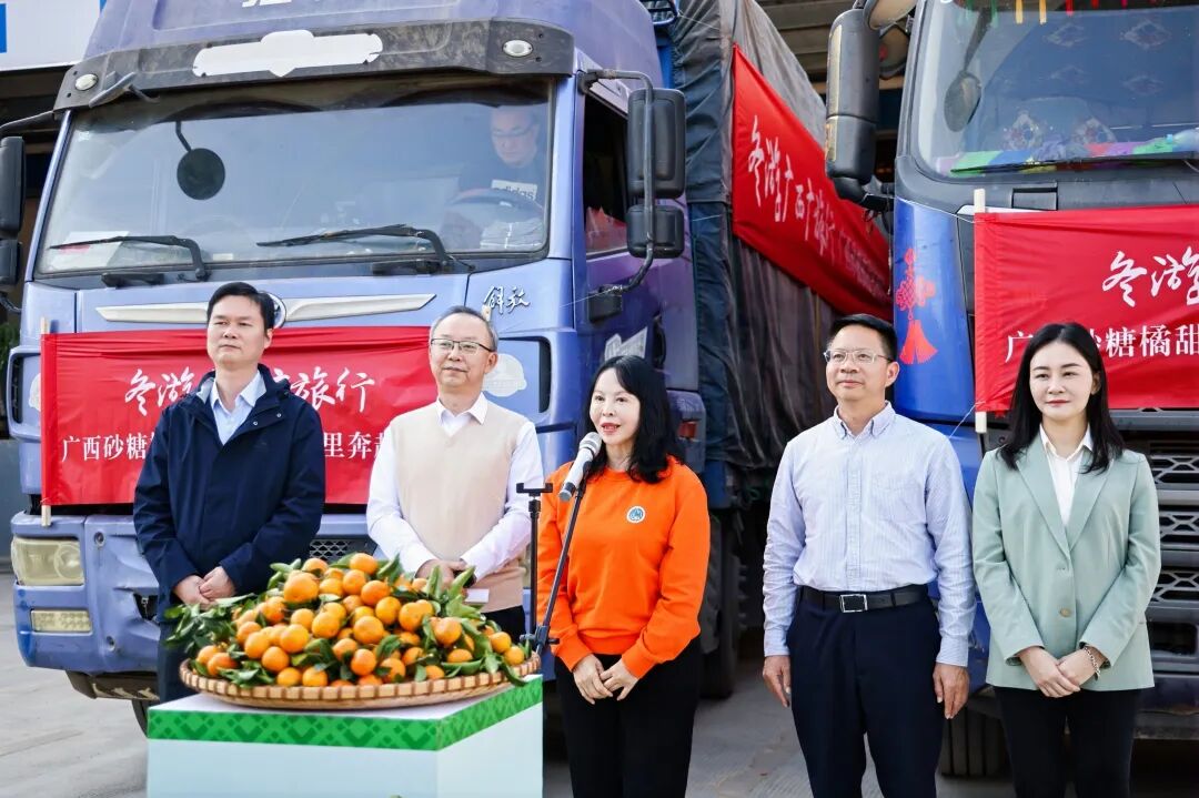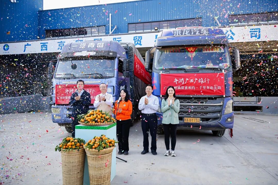 11月30日,以“冬游广西广旅行,广西砂糖橘甜蜜相约·千里奔赴沈阳”为主题的发车仪式在广西旅游发展集团旗下广西京贸国际贸易有限公司举行。10万斤广西砂糖橘将分批从南宁以及产地百色西林发出,踏上前往沈阳的3000多公里旅程。此次活动旨在通过砂糖橘这一甜蜜“使者”,传递广西的热情与祝福,这一举措不仅是“广西老友”对“东北老铁”的深情回应,也标志着“冬游广西广旅行”沈阳文旅招商推介活动正式拉开帷幕,为桂辽两地的文化旅游交流与合作注入新的活力。广西旅游协会副会长兼秘书长高琳,广西旅游发展集团党委宣传部部长、品牌营销部总经理谢兆山,广西旅发实业有限公司党委书记、董事长张少东,以及相关单位代表、媒体嘉宾约100人参加发车仪式,共同见证这次甜蜜且温暖的“文旅之约”开启。“冬游广西广旅行,广西砂糖橘一路向北看老铁!发车!”。当天下午3点,广西旅游协会副会长兼秘书长高琳宣布发车,满载着砂糖橘的货车队伍有序驶出京贸公司仓储基地,“奔赴”活动目的地——沈阳。这批砂糖橘不仅是广西优质的特色农产品,更象征着桂辽两地友谊与交流的再次升华。10万斤广西砂糖橘送抵沈阳后,部分砂糖橘将于12月2日至5日在沈阳北陵公园正门、沈阳故宫、中街等派送点进行免费分发,为当地市民群众送上一份来自壮乡广西的甜蜜与祝福。