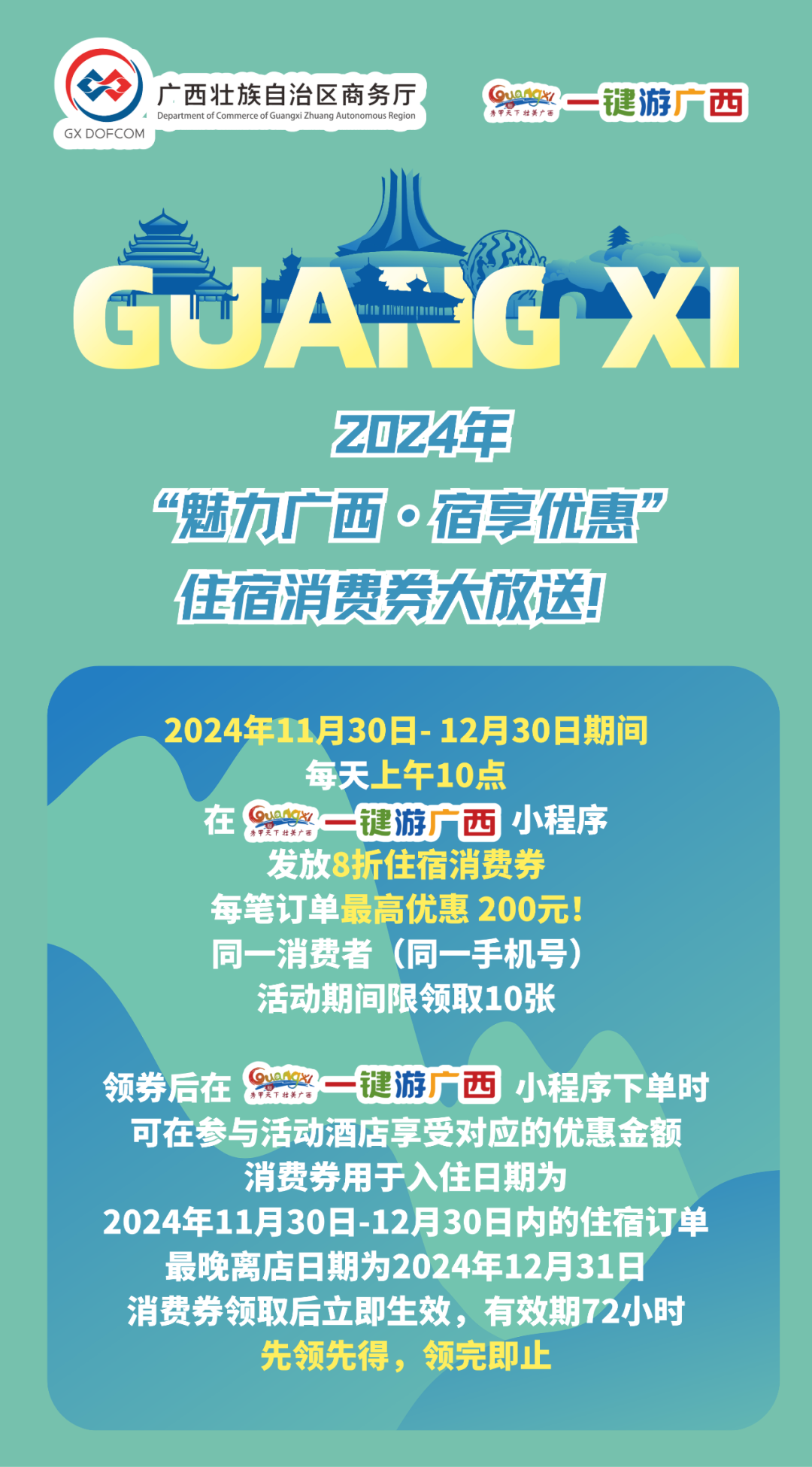 由自治区商务厅举办的2024广西惠买暖冬消费季“魅力广西·宿享优惠”住宿消费券发放活动强势来袭!快来参与活动,一起相遇在温暖舒适、缤纷多彩的广西!