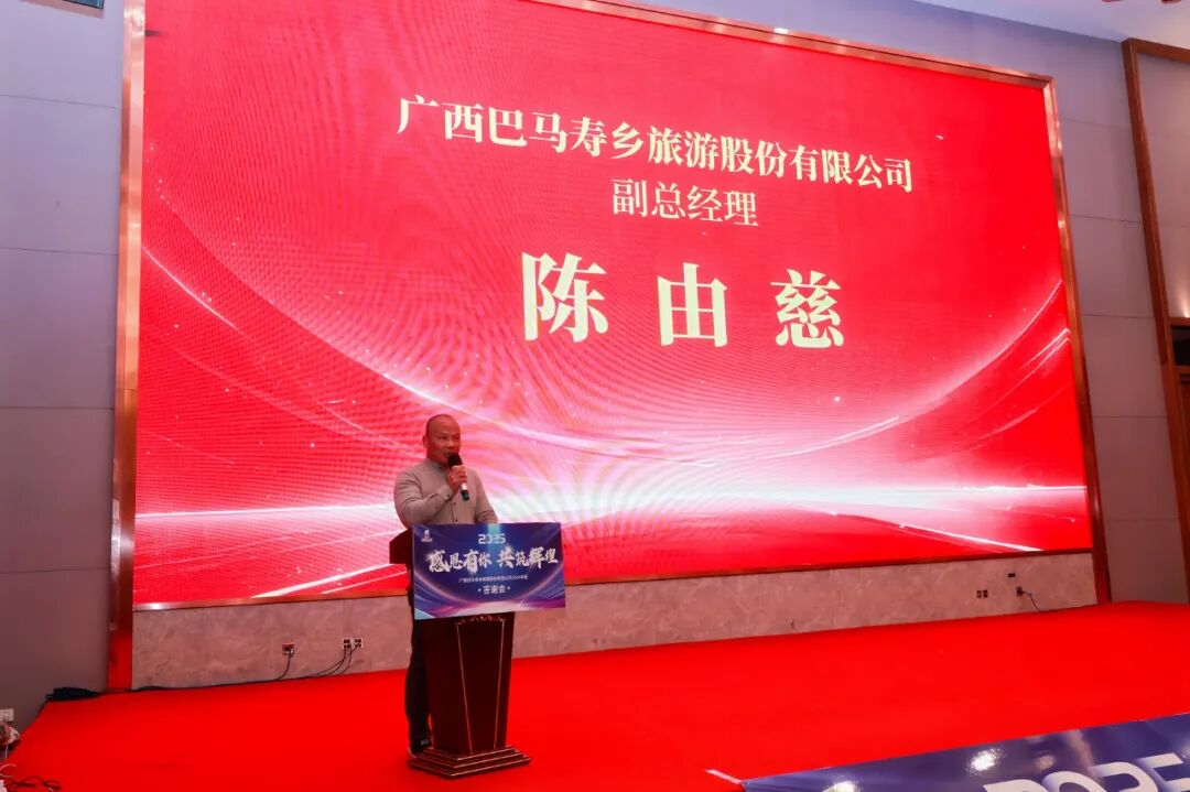 广西巴马寿乡旅游股份有限公司副总经理陈由慈先生发表讲话。他表示,回顾过去,公司始终坚持诚信、共赢的原则,在各个领域与客户开展了广泛的合作,取得了非常好的成绩。通过合作,不仅增进了彼此的了解和友谊,还加强未来共创辉煌的信心。这些合作成果,不仅是我们共同努力的见证,也是我们未来发展的坚实基础。大道至简,实干为要,乘风破万里,奔赴新的征程。