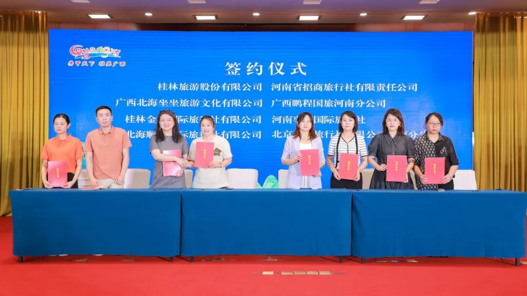 ▲ 旅游企业代表推介广西夏季旅游精品线路、产品及民族风情演艺经过对接和洽谈,两地旅游企业达成客源互送口头协议57项,桂林旅游股份有限公司与河南省招商旅行社有限责任公司,广西北海坐坐旅游文化有限公司与广西鹏程国旅河南分公司,桂林金屹国际旅行社有限公司与河南事嘉国际旅行社,北海顺日国际旅行社有限公司与北京相约旅行社有限公司河南分公司现场签订了战略合作协议。为下一步两地旅游企业在产品打造、市场互动、客源互送等方面打下了良好的基础。